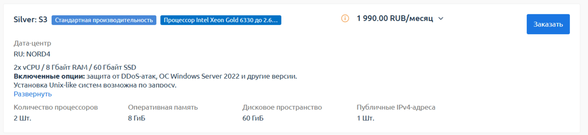 Тариф S3: 2vCPU, 8Gb RAM, 60Gb диск