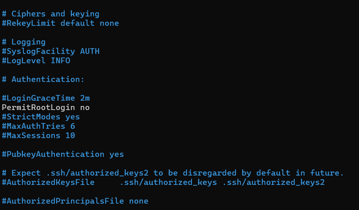 Далее - запрет root подключения к sshВведите команду sudo nano /etc/ssh/sshd_config, найдите строку PermitRootLogin и укажите значение no