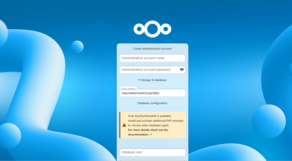 - Подключитесь к веб-интерфейсу Nextcloud с помощью <hostname>.local и введите данные для создания учётной записи Администратора Nextcloud