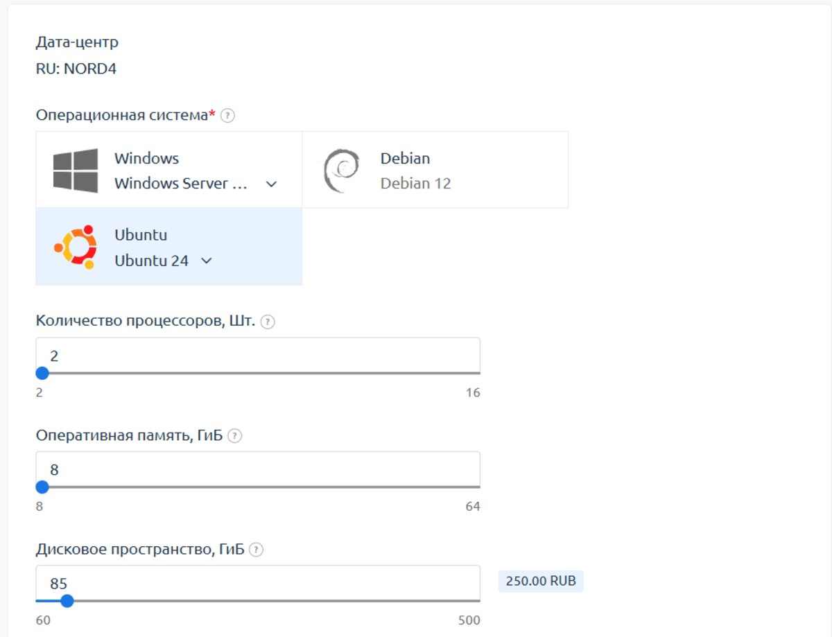 - Выберите необходимую ОС, в нашем случае, Ubuntu 24(которая есть LTS версия ОС) и по необходимости измените ресурсы виртуальной машины