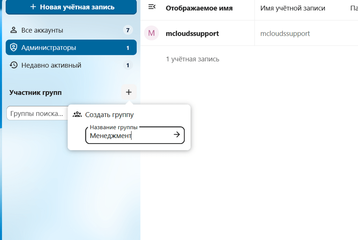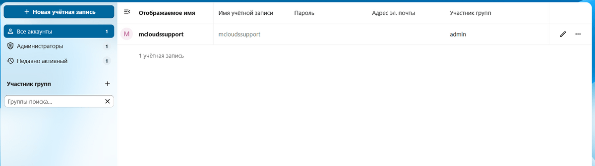 Перейдём к созданию пользователей. Нажмите "Новая учётная запись"