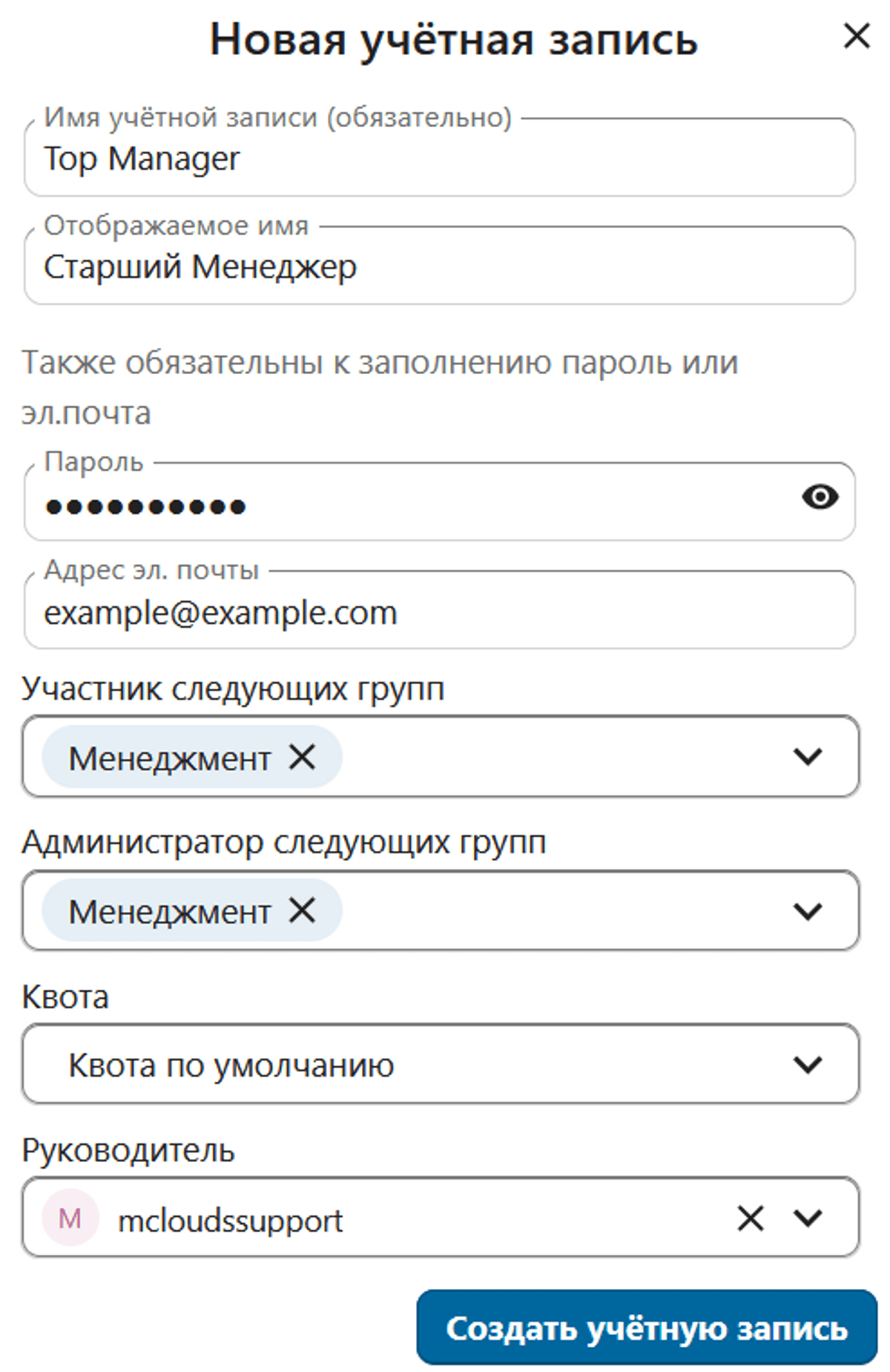 Заполните небходимые поля и нажмите "Создать учётную запись"