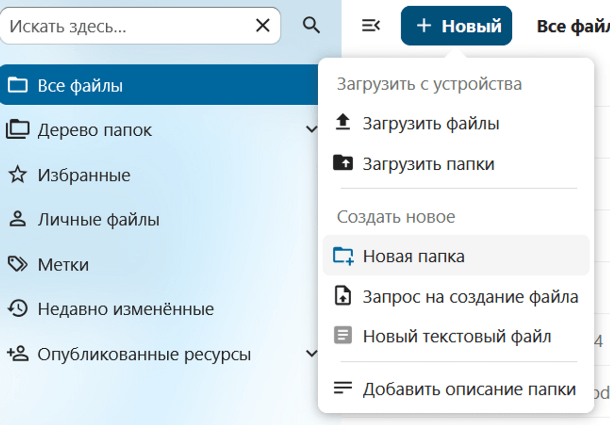 - Чтобы создать новую папку или загрузить файл, нажмите "Новый" или используйте Drag'n'Drop