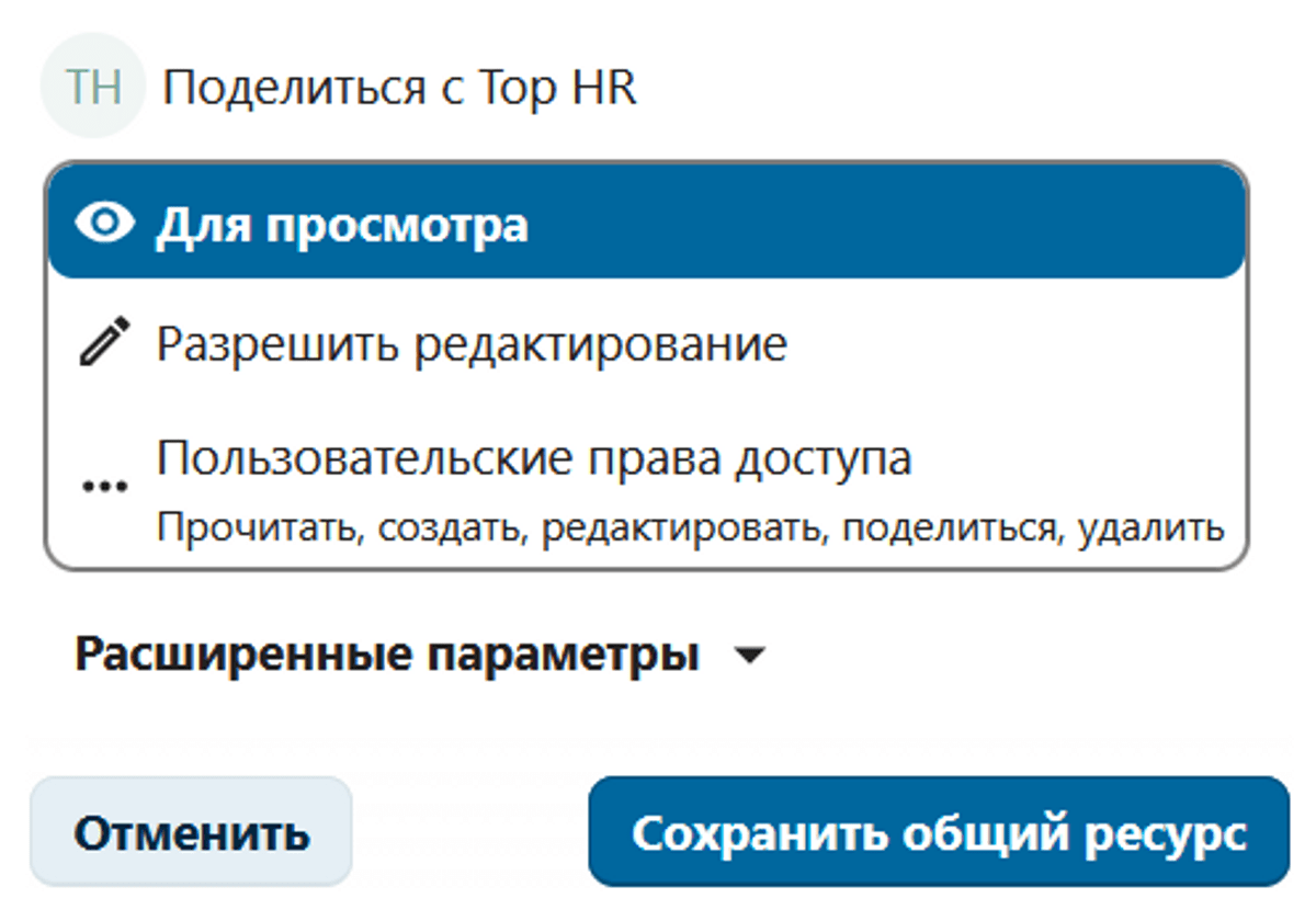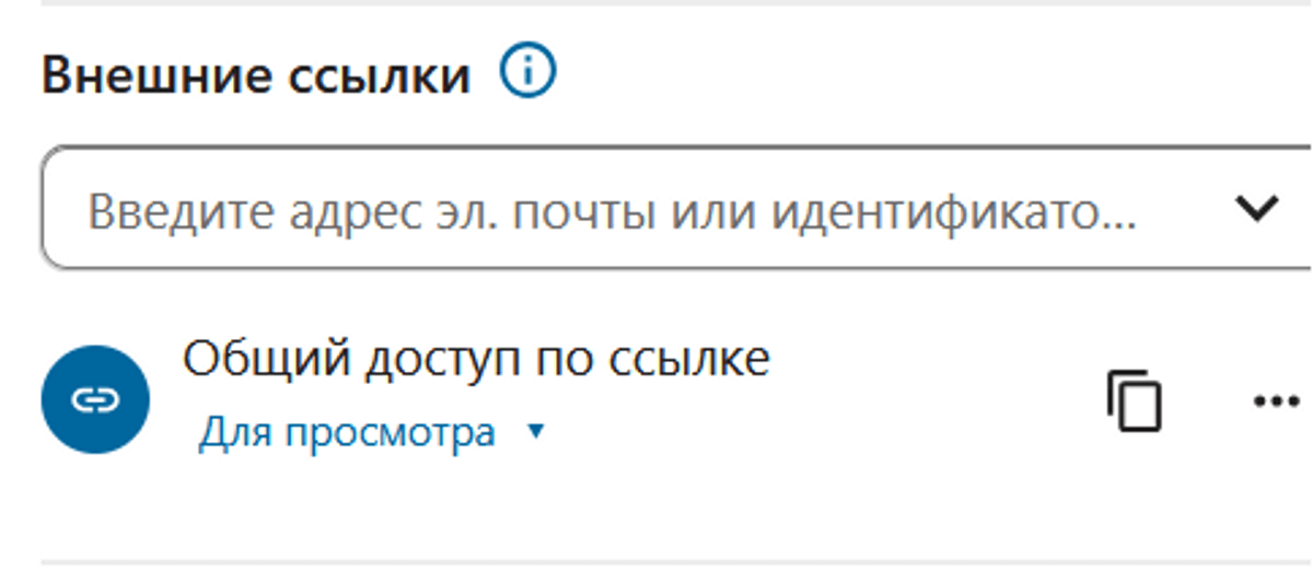 - После нажатия на "Общий доступ по ссылке" появилось меню с доступными предустановленными разрешениями