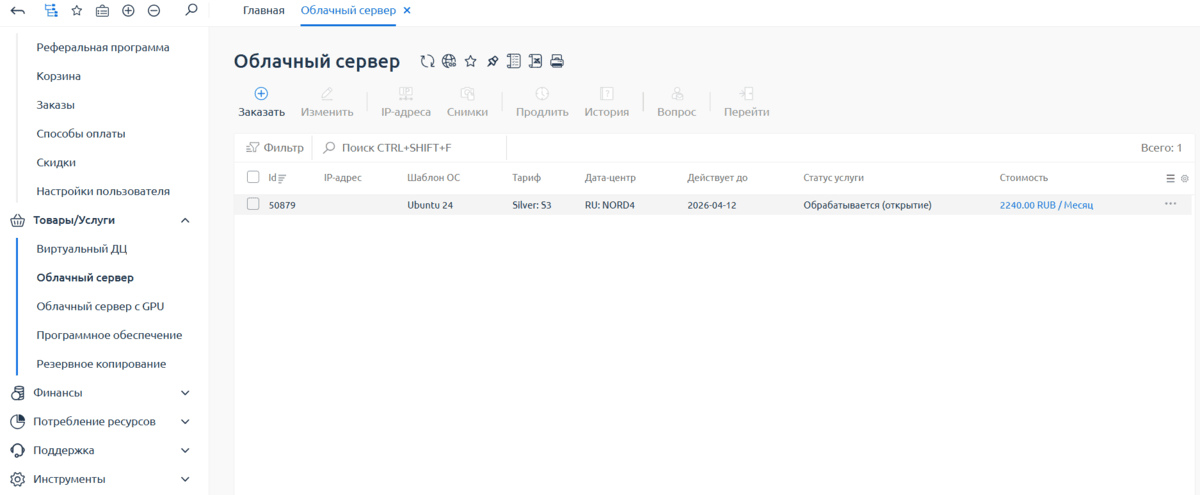 - После оплаты сервера вы сможете его найти в разделе "Товары/Услуги" -> "Облачный сервер"