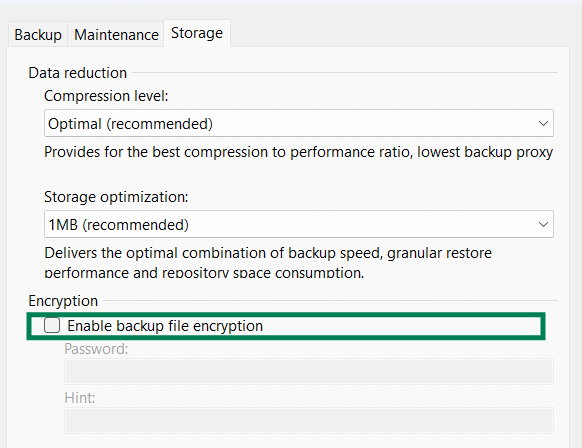 7. Перейдите на вкладку «Storage», чтобы настроить процедуру сжатия резервной копии.Механизм проверки объектного хранилища заключается в проверке метаданных и доступности блоков, проверка информации внутри блоков не проводится. Чтобы включить механизм стандартной проверки данных, отметьте пункт «Verify content of each object in backup».