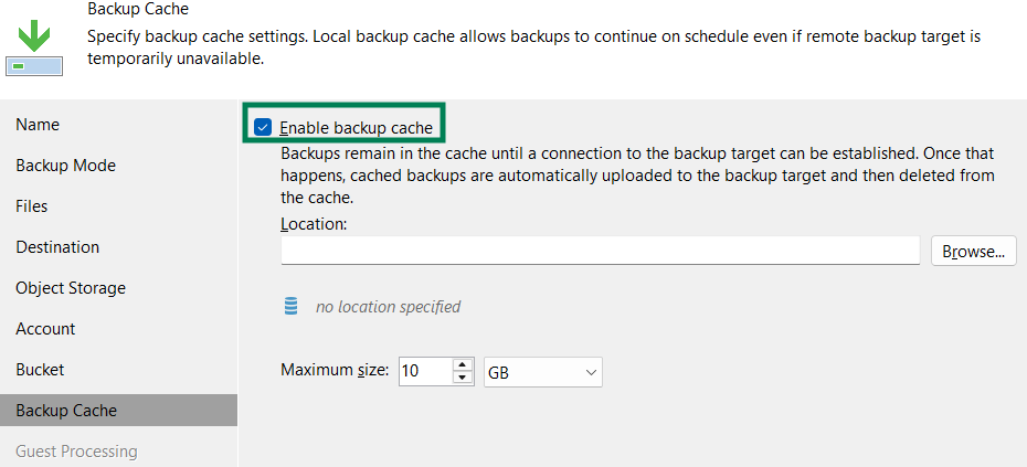 - Если необходимо, выберите функцию включения кэша резервной копии. В случае, если во время выполнения резервного копирования сервер недоступен, Veeam Agent будет хранить бэкап в указанной локации, когда связь с сервером будет восстановлена, начнётся процесс загрузки резервной копии на сервер, после окончания процесса, временная копия будет удалена.