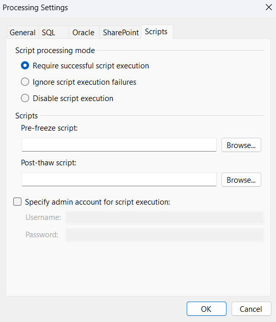 1. Очистить журналы2. Не очищать журналы3. Выполнять резервное копирование журналов периодичноИ политику хранения журналов:1. Хранить журналы, пока связанная резервная копия системы активна2. Сохранять только последние N дней6. Microsoft SharePoint:1. Для резервного копирования SharePoint Сервера: роль Farm Administrator2. Для резервного копирования баз данных Microsoft SQL из SharePoint необходимы те же права и роли, как для Microsoft SQL Server7. Если Вы планируете выполнять резервное копирование ПО, которое не поддерживает Microsoft VSS, вы можете указать какие скрипты Veeam Agent должен выполнять для того, чтобы выполнить VSS Snapshot.1. Выберите режим выполнения скриптов2.Укажите путь к Pre-Freeze скрипту3. Укажите путь к Post-Thaw скрипту4. Укажите данные учётной записи от лица которой будут запущены скрипты