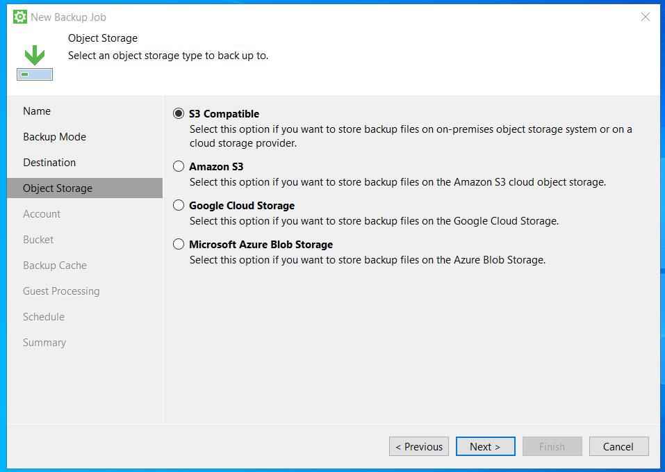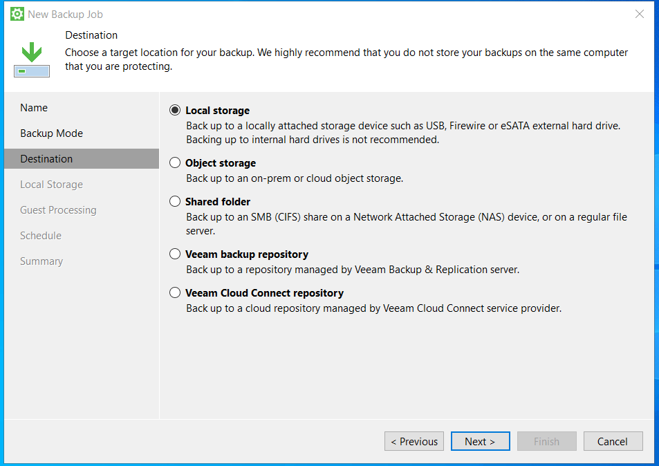 - Выберите тип хранилища резервной копии. В качестве его можно выбрать один из следующих вариантов:Local storage – Сохранить бэкап к локально присоединённому хранилищу, например, USB, внешний жёсткий диск и т.д. Сохранение на внутренние диски системы не рекомендуется.Object Storage – Загрузить бэкап в on-premise или облачное объектное хранилищеShared folder – Загрузить бэкап на стандартный файловый сервер или SMB папкуVeeam backup repository – Загрузить бэкап в репозиторий, управляемый Veeam B&R серверомVeeam Cloud Connect repository – Загрузить бэкап в облачное хранилище обслуживаемое провайдером сервиса Veeam Cloud Connect