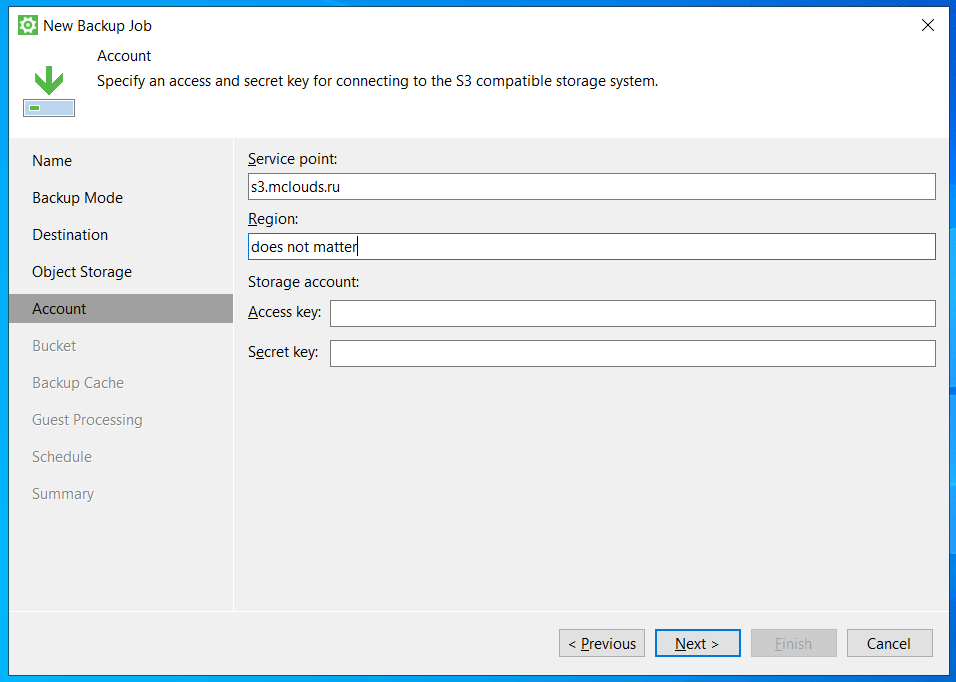- Введите данные для подключения к S3 серверу
