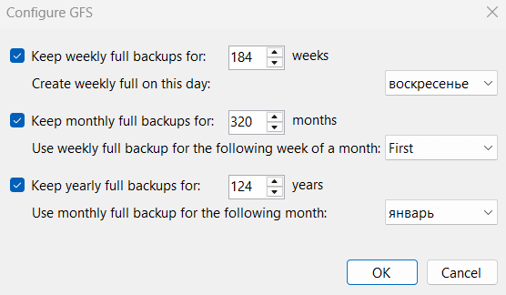 3. Чтобы использовать схему GFS(Grandfather-Father-Son) отметьте пункт «Keep Certain full backups longer...», нажмите «Configure»