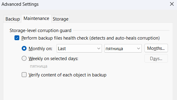 6. Для того, чтобы периодически выполнять проверку цепи резервных копий, перейдите во вкладку «Maintenance» и отметьте «Perform backup files health check», выберите время проведения проверки