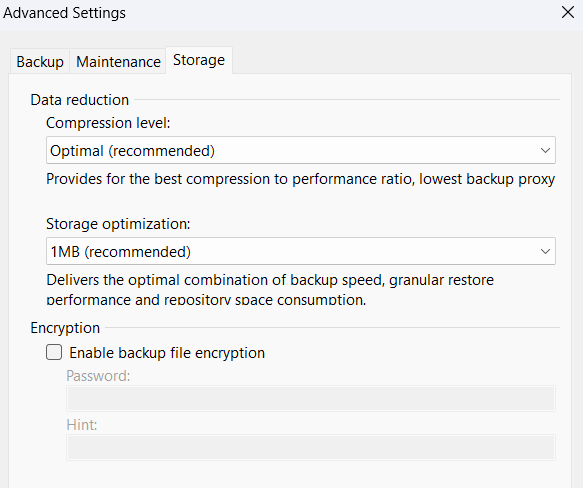 1. None – Без Сжатия2. Dedupe-friendly – Rle – Оптимальный уровень для небольшой нагрузки на процессор3. Optimal – Lz4 – Рекомендуемый Veeam уровень сжатия, размер резервной копии и время выполнения операции сжатия сбалансированы4. High – Zstd 3 – Предоставляет больший уровень сжатия, на 60% от уровня optimal, но увеличивает нагрузку на процессор и время выполнения резервного копирования в 2 раза5. Extreme – Zstd 9 – Предоставляет наименьший размер резервной копии, рекомендуется использовать данный уровень на машинах, имеющих 6-ти ядерный процессор.Также, укажите размер блоков данных хранилища