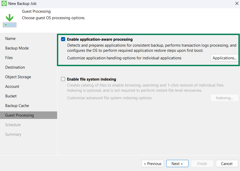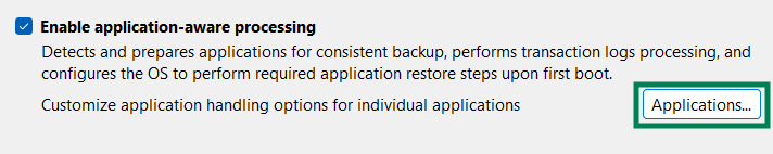 - По умолчанию, Veeam Agent не обрабатывает журналы транзакций и приложения, которые пользуются данными журналами для обеспечения восстановления, целостности и доступности информации. Чтобы при аварии была возможность восстановить журналы транзакций, используйте функцию «Enable application-aware processing»
