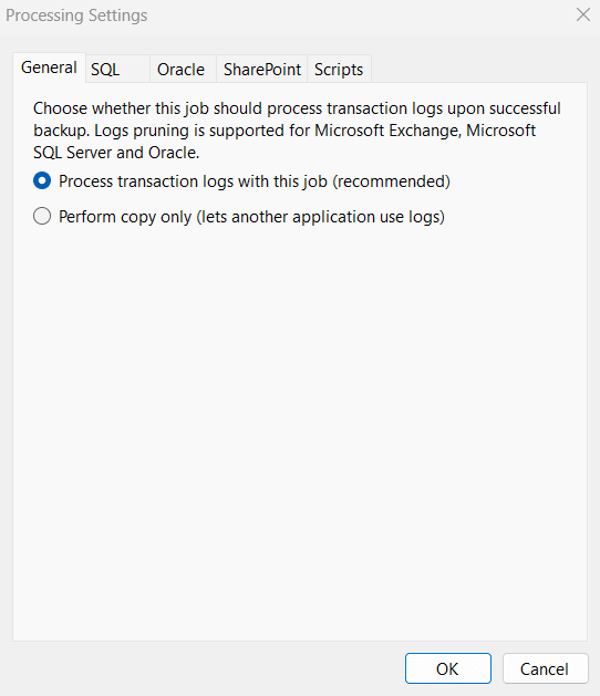 3. В случае, если Вы используете другое ПО для поддержания отказоустойчивости состояния баз данных, выберите «Perform copy only», чтобы Veeam Agent выполнил резервное копирование журналов, очистки журналов при данном выборе не происходит.
