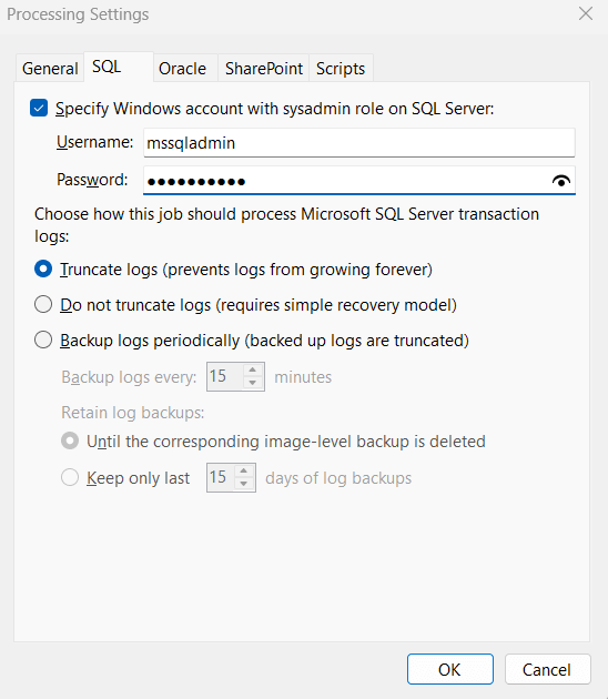 1. Очистить журналы2. Не очищать журналы3. Выполнять резервное копирование журналов периодичноИ политику хранения журналов:1. Хранить журналы, пока связанная резервная копия системы активна2. Сохранять только последние N дней6. Microsoft SharePoint:1. Для резервного копирования SharePoint Сервера: роль Farm Administrator2. Для резервного копирования баз данных Microsoft SQL из SharePoint необходимы те же права и роли, как для Microsoft SQL Server7. Если Вы планируете выполнять резервное копирование ПО, которое не поддерживает Microsoft VSS, вы можете указать какие скрипты Veeam Agent должен выполнять для того, чтобы выполнить VSS Snapshot.1. Выберите режим выполнения скриптов2.Укажите путь к Pre-Freeze скрипту3. Укажите путь к Post-Thaw скрипту4. Укажите данные учётной записи от лица которой будут запущены скрипты