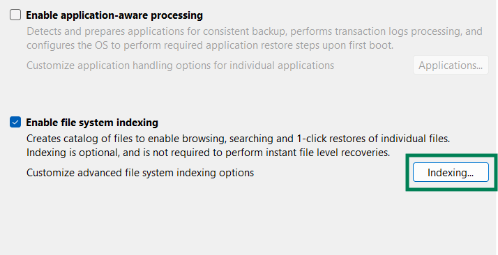 - Для того, чтобы Veeam Agent создал каталоги для быстрого обнаружения необходимых файлов и удобного гранулярного восстановления, используйте параметр «Enable file system indexing» По умолчанию, происходит индексирование всех файлов за исключение системных папок. Чтобы добавить папки/файлы в исключения или добавить системные папки в индексирование, нажмите «Indexing»