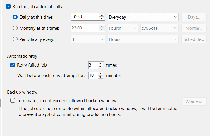 - На вкладке расписания задачи резервного копирования выберите необходимые параметры В случае, если Вам необходимо, чтобы резервное копирование не пересекалось с определенным временным промежутком дня, выберите параметр «Terminate job if it exceeds allowed backup window»