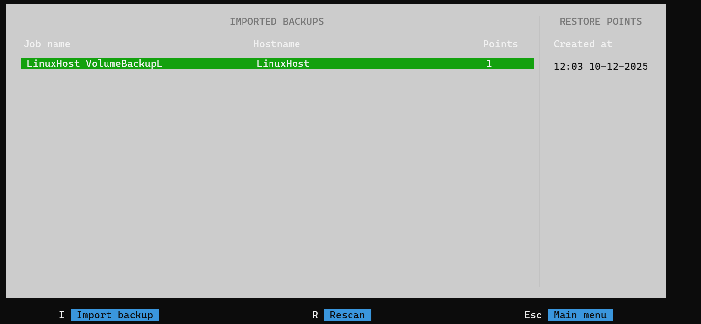 - Выберите точку восстановления. В списке импортированных точек перечислены резервные копии из текущих задач на ВМ, если необходимо импортировать точку из хранилища, нажмите горячую клавишу "I"