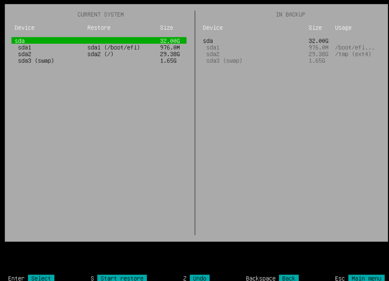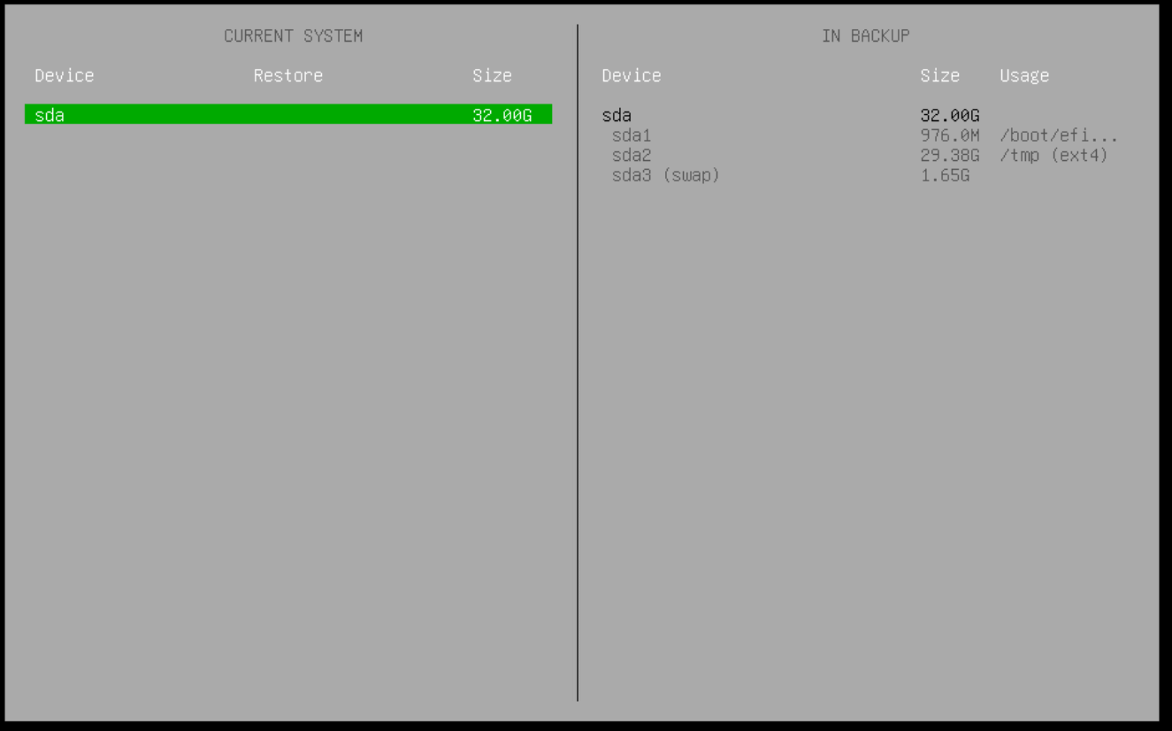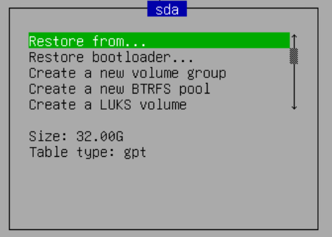 Укажите настройки диска для восстановления. Так как в нашем случае не использовался LVM, выбираем Restore From.