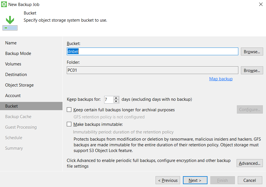 - Выберите Bucket и папку для хранения резервной копии. При необходимости, укажите дополнительные параметры копии.