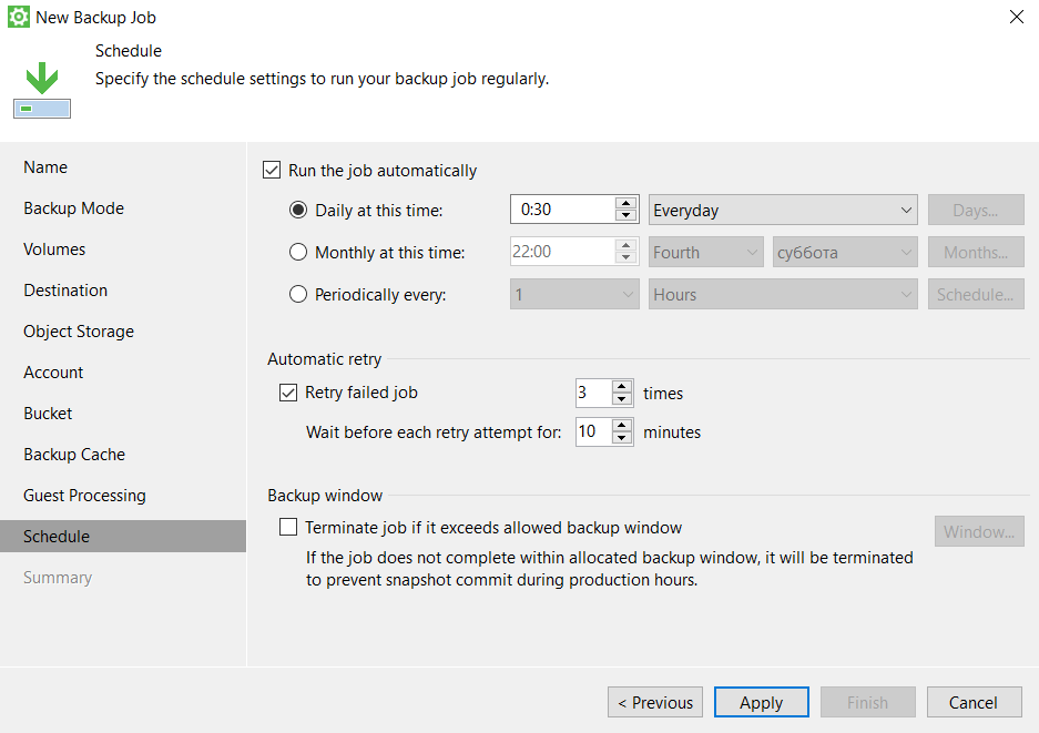 - Проверьте сводку о задаче и нажмите Apply. Если необходимо выполнить задачу после завершения настройки, отметьте пункт «Run the job when i click Finish»