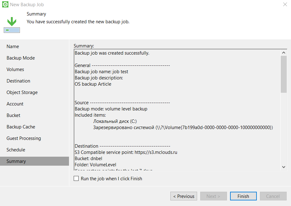 - Проверьте сводку о задаче резервного копирования и нажмите «Finish»