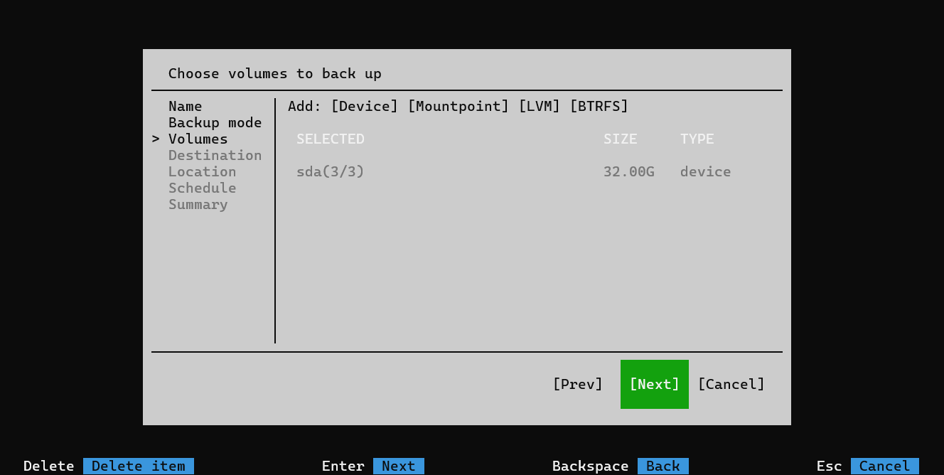 - volume_to_backup – объекты резервного копирования. /dev/sdX