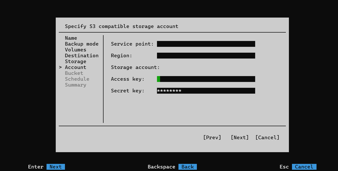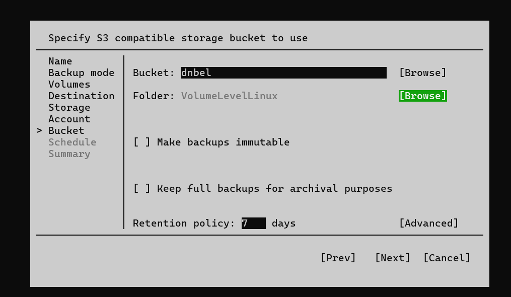 - Выберите Bucket и папку для хранения резервной копии. При необходимости, укажите дополнительные параметры копии