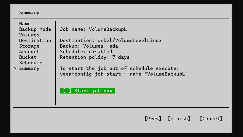 Для создания задачи резервного копирования диска введите в терминале команду sudo veeamconfig job create volumelevel --name <job_name> --reponame <repository_name> --objects <volume_to_backup> <advanced_options> <schedule_options> <periodic_full_backup_options> <indexing_options> ,где: