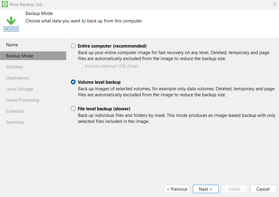 - Установите тип резервного копирования - «Volume level backup» для РК дисков, «File level backup» для РК файлов