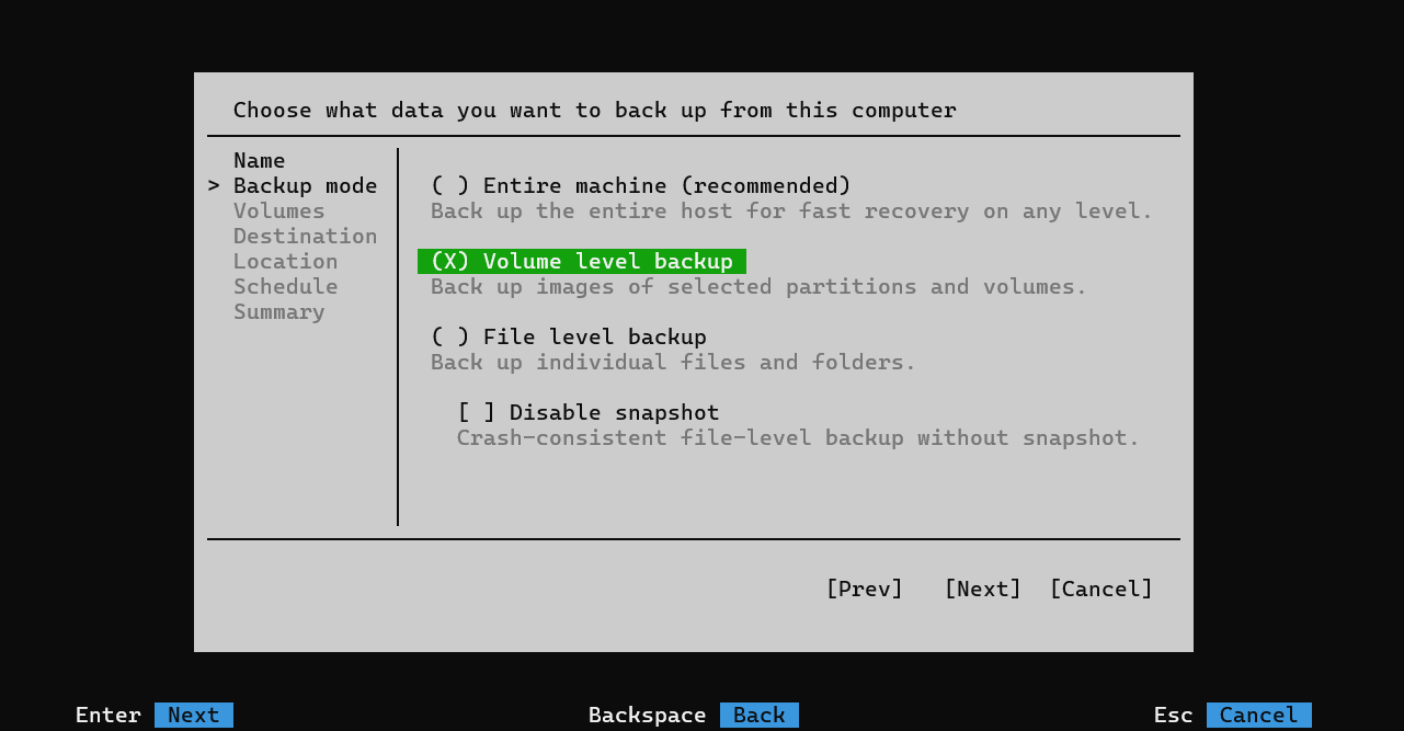 - Установите тип резервного копирования - «Volume level backup» для РК дисков, «File level backup» для РК файлов