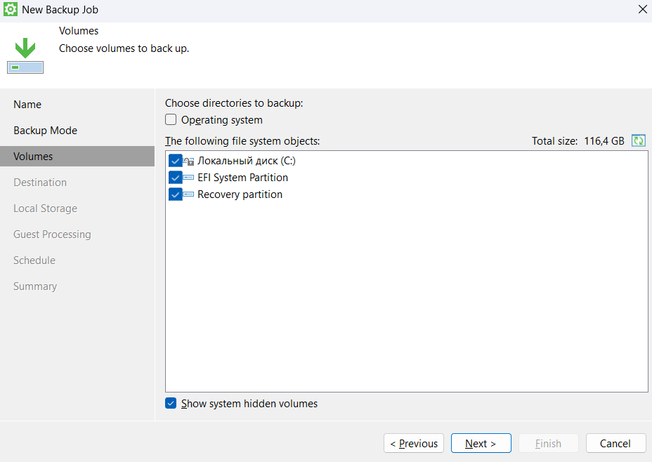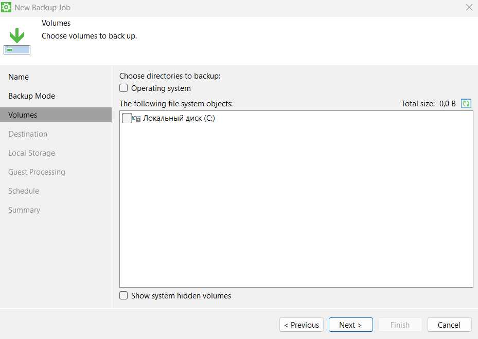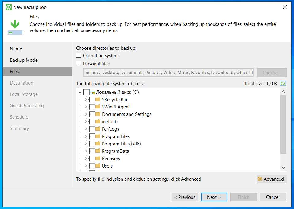 1. Если отметить пункт «Operating System», то будет произведено РК всей операционной системы2. Если отметить пункт Personal files, то будет создана резервная копия профиля пользователя. По умолчанию, Veeam agent не производит резервное копирование пермещаемых профилей и Application Data. Чтобы изменить поведение программы, перейдите в «Choose»3. Чтобы указать маски для имён и расширений файлов, перейдите в «Advanced»