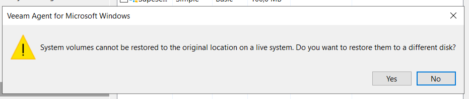 - В случае, если вы выполняли резервную копию системного диска, Veeam Agent запросит у Вас разместить его в другом диске