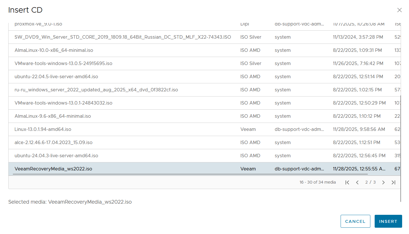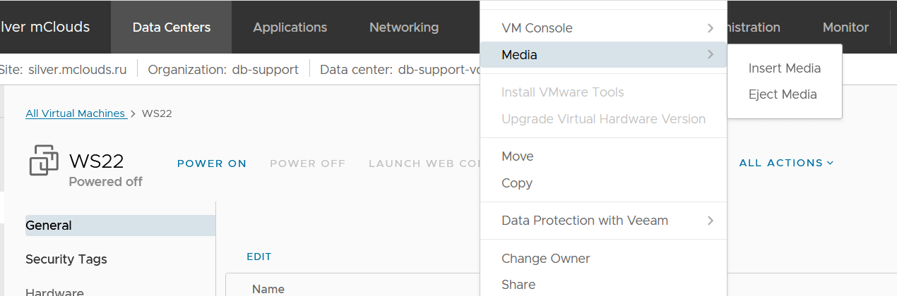 - Подключите образ восстановления к ВМ. Для этого, в vCloud Director нажмите All Actions и виберите media - insert media
