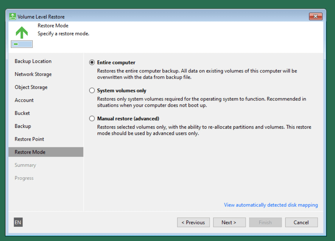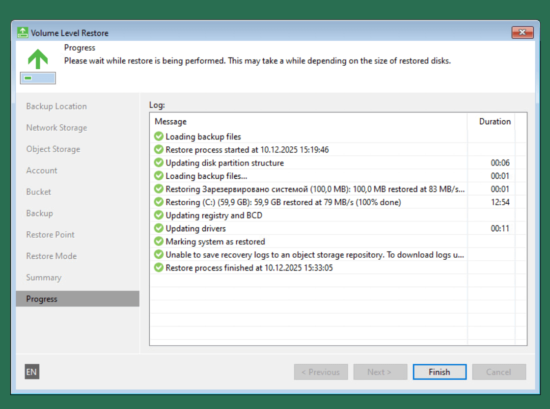 - Дождитесь конца восстановления, нажмите Finish и перезагрузите систему