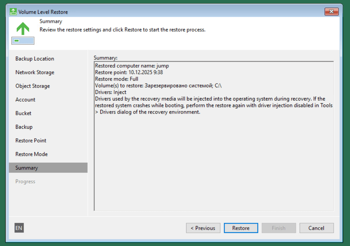 На этом восстановление виртуальной машины с ОС Windows из образа восстановления завершено.