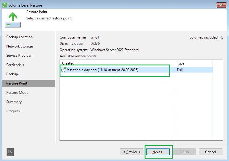 - Выберите ВМ, которую вы хотите восстановить в новую. В нашем случае – это vm01