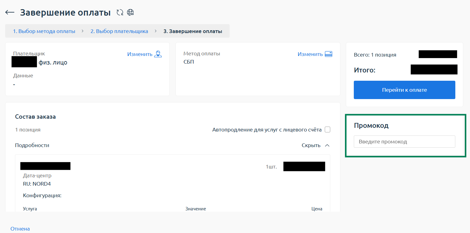 Для того, чтобы применить промокод для оплаты заказанных услуг, выполните следующие шаги: