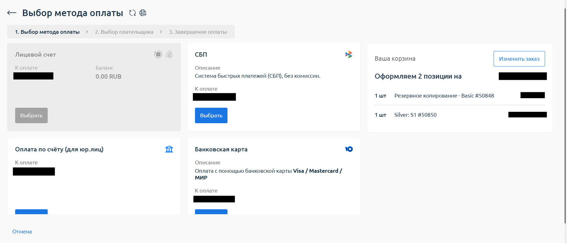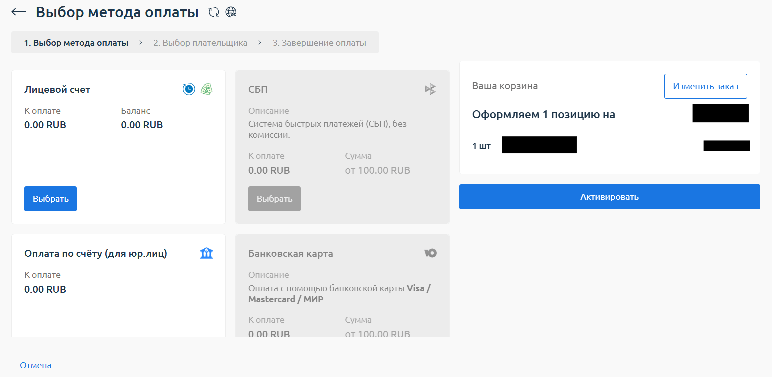 - И далее, при выборе метода оплаты, промокод будет отображён в информации об услуге и можно будет выбрать метод оплаты "Лицевой счёт" или Оплатить по счёту для юридических лиц