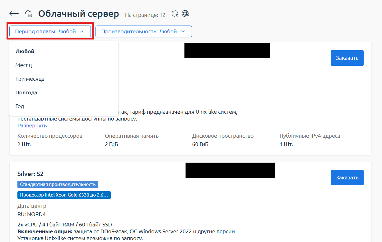 - Осталось выбрать период, за который вы собираетесь оплатить сервер и добавить заказ в корзину или сразу оплатить.