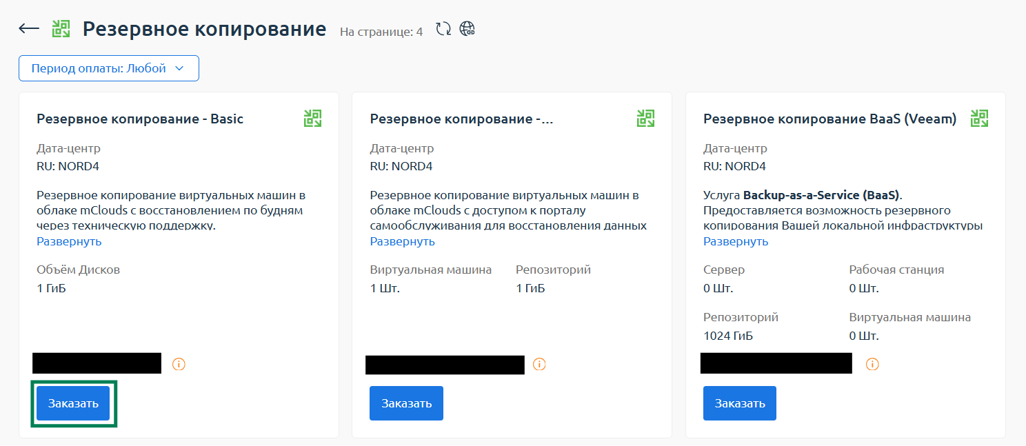 - Для оформления перейдите в раздел “Товары/Услуги” -> “Резервное копирование” и нажмите “Заказать”.