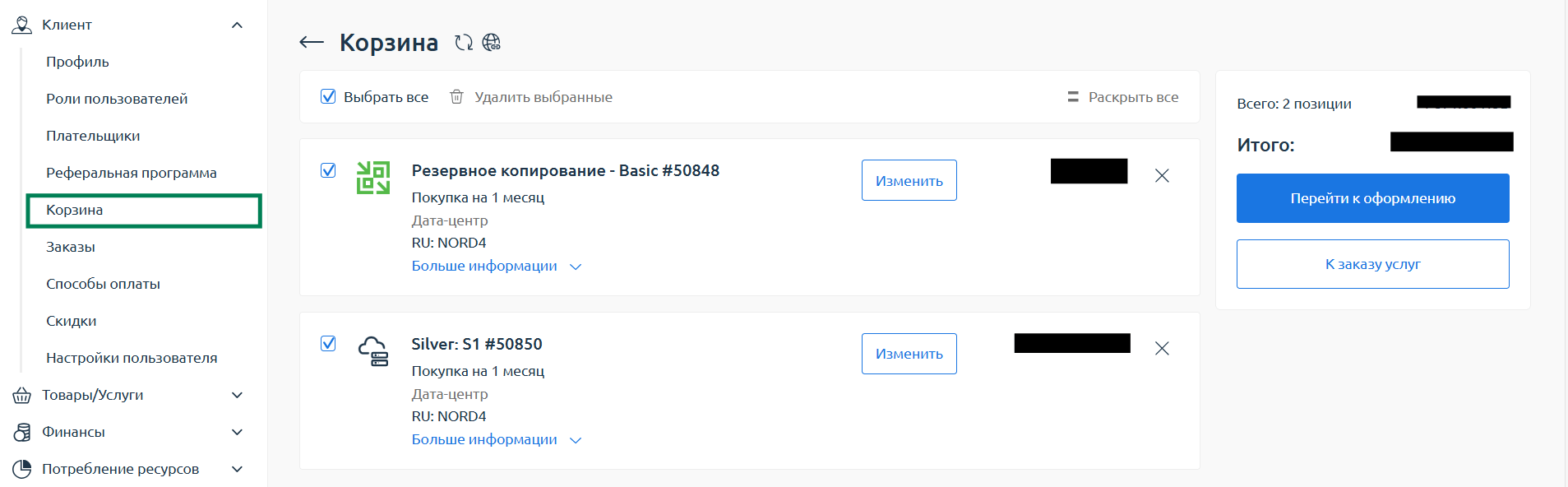 За всю статью у нас накопилось много услуг в корзине. Давайте рассмотрим процесс оформления заказа. Перейдите в раздел “Клиент” -> “Корзина”: