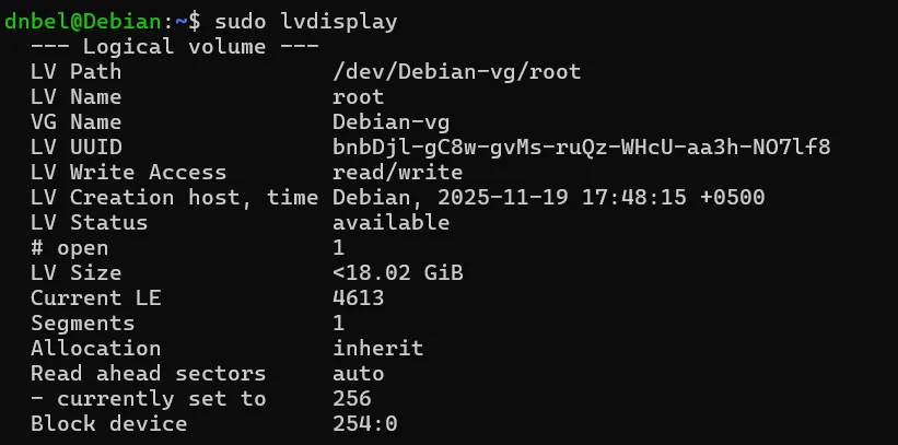 sudo lvdisplayпросмотрите все существующие логические тома и определите необходимый для расширения