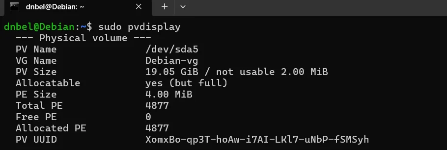 sudo pvdisplayи определите нужный (имя в поле PV Name)