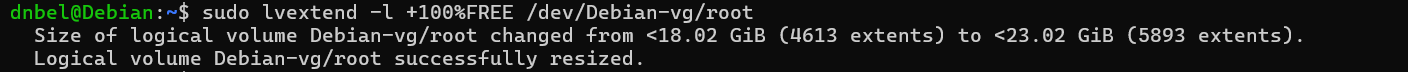sudo lvextend –l +100%FREE /dev/<vg-name>/<lv-name>