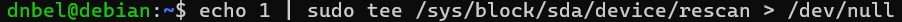 echo 1 | sudo tee /sys/block/sda/device/rescan > /dev/null
