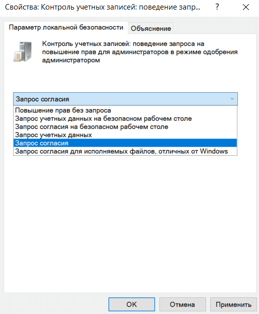 - Найдите параметр «Контроль учетных записей: Поведение запроса на повышение прав дляАдминистраторов в режиме одобрения администратором» или «User account control: behavior of the elevation prompt for administrators in admin approval mode»