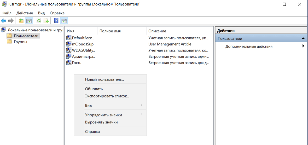 - Перейдите в папку «Пользователи» -> нажмите правой кнопкой мыши на свободномпространстве -> выберите «Новый пользователь»