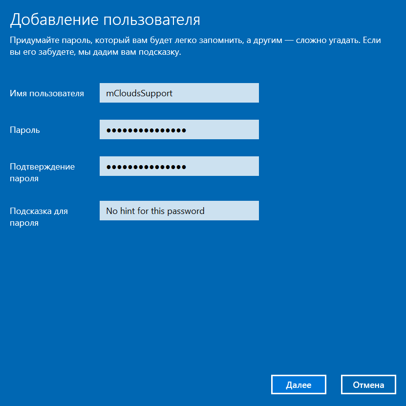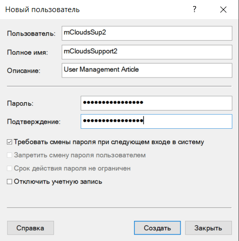 New-LocalUser -Name ‘<Имя учетной записи>’ -Description '<Описание учётной записи>' –Password $pass